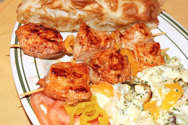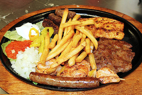 Meat platter with grilled chicken, cevapi, pljeskavica and chicken skewers.