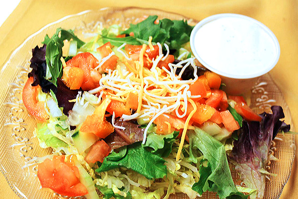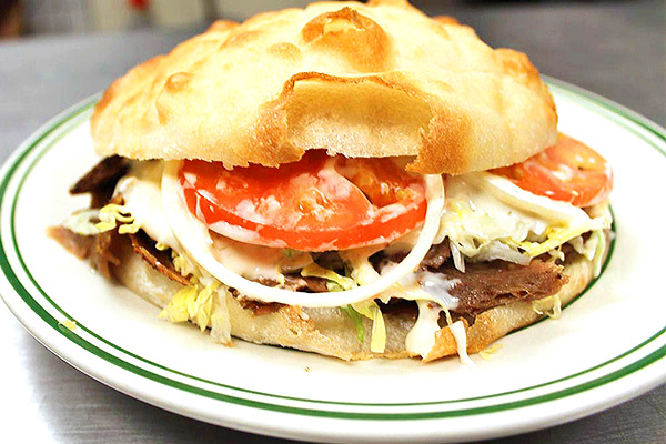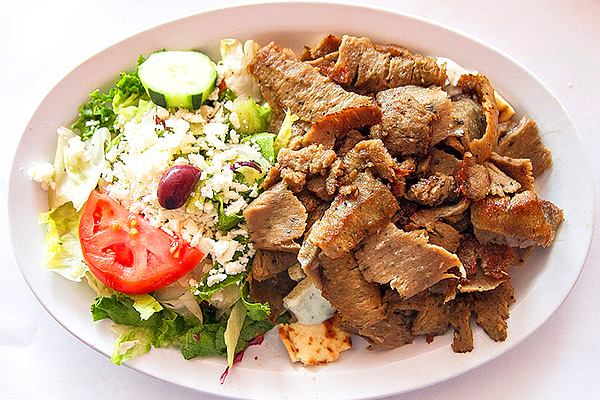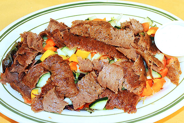 Sliced beef, lettuce, tomato, onion, tzatziki sauce