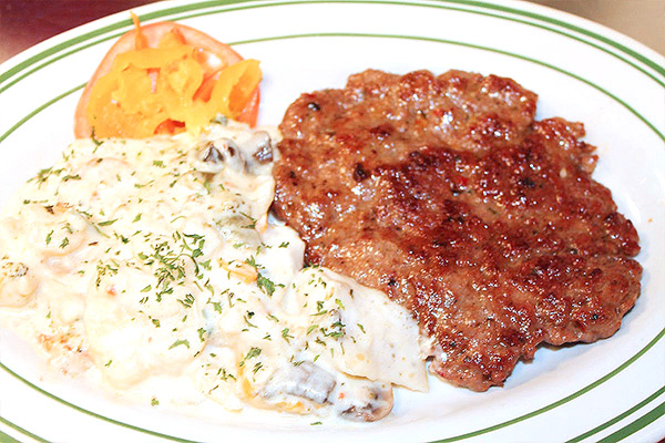 Breakfast sausage with your choice of eggs, scrambled or sunny side up. Served with a side of sour cream, and Coffee
