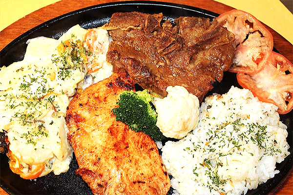 A sizzling plate combination of chicken, veal, baked potatoes w/ vegetables, rice
